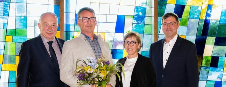 Erste Glückwünsche und einen Blumenstrauß erhielt Neu-Chefarzt Dr. Ulf Kilian nach der Ernennung von seinem ärztlichen Vorgänger Dr. Ulrich Socha, von der Theologischen Geschäftsführerin Maria Beyer und vom Kaufmännischen Geschäftsführer Dirk Herrmann (v. l. n. r.). Foto: Kay Zimmermann
